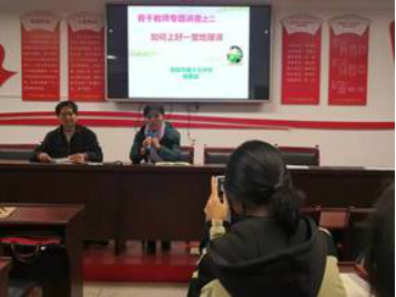 图3 副董事长唐中林做专题报告 图4 地理骨干教师杨素娥做专题讲座
