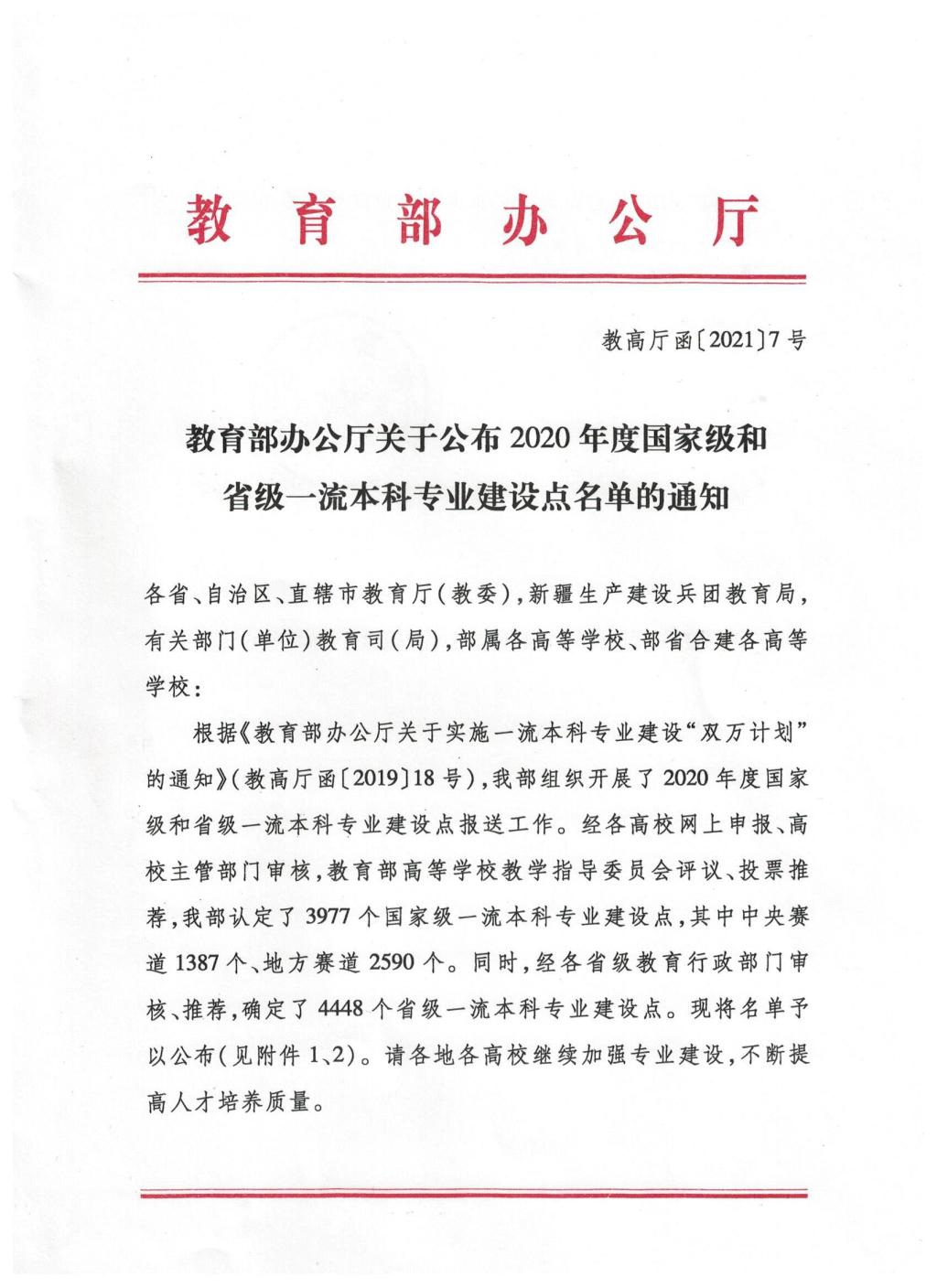 近日,教育部印发了《教育部办公厅关于公布2020年度国家级和省级一流本科专业建设点名单的通知》(教高厅函〔2021〕7号),公司地理科学专业正式获批国家级一流本科专业建设点。这是公司在专业建设和人才培养方面取得的又一重大突破。